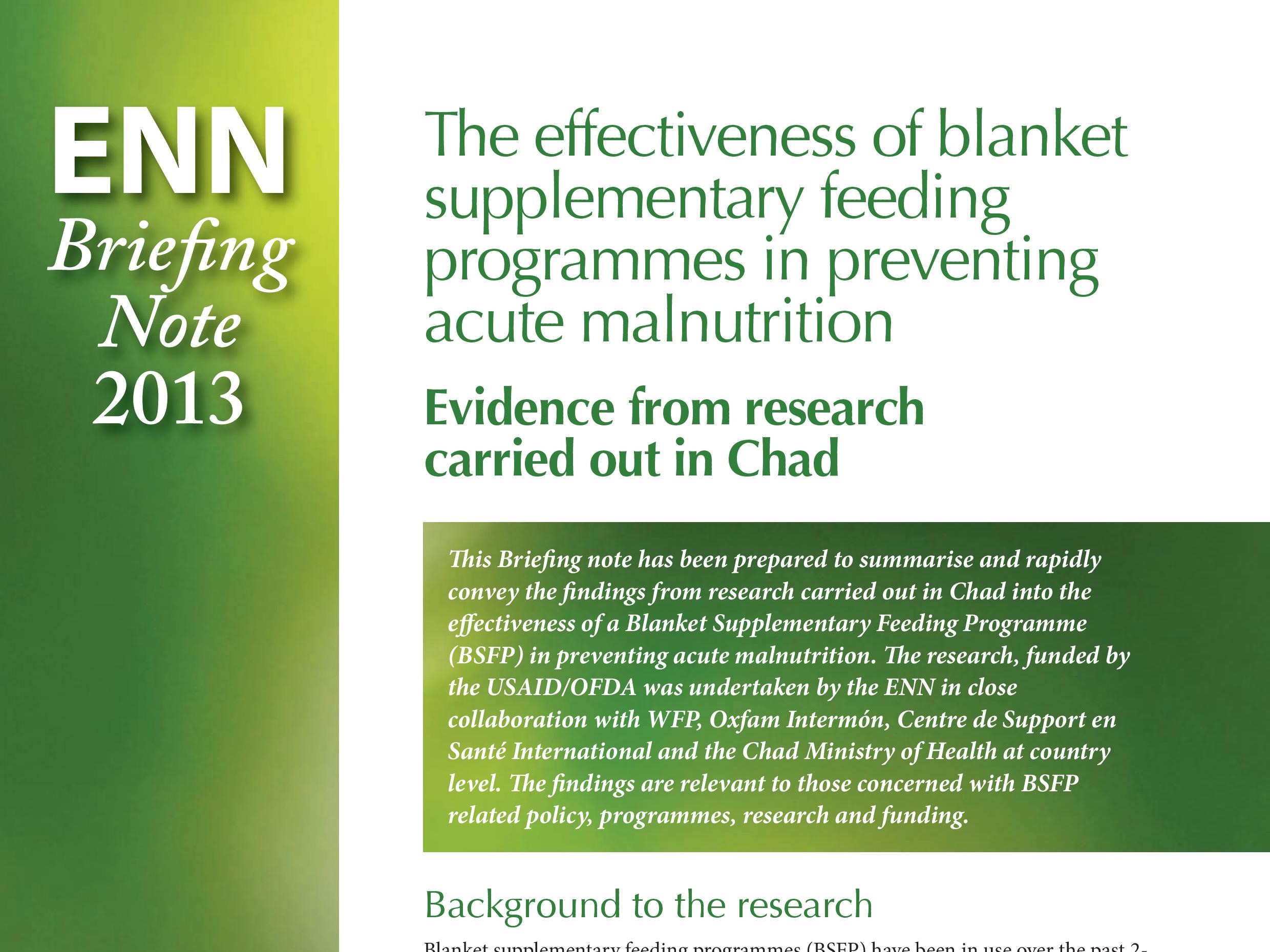 (BSFP) in preventing acute malnutrition. The research, funded by the USAID/OFDA was undertaken by the ENN in close collaboration with WFP, Oxfam Intermón, Centre de Support en Santé International and the Chad Ministry of Health at country level. The findings are relevant to those concerned with BSFP related policy, programmes, research and funding.