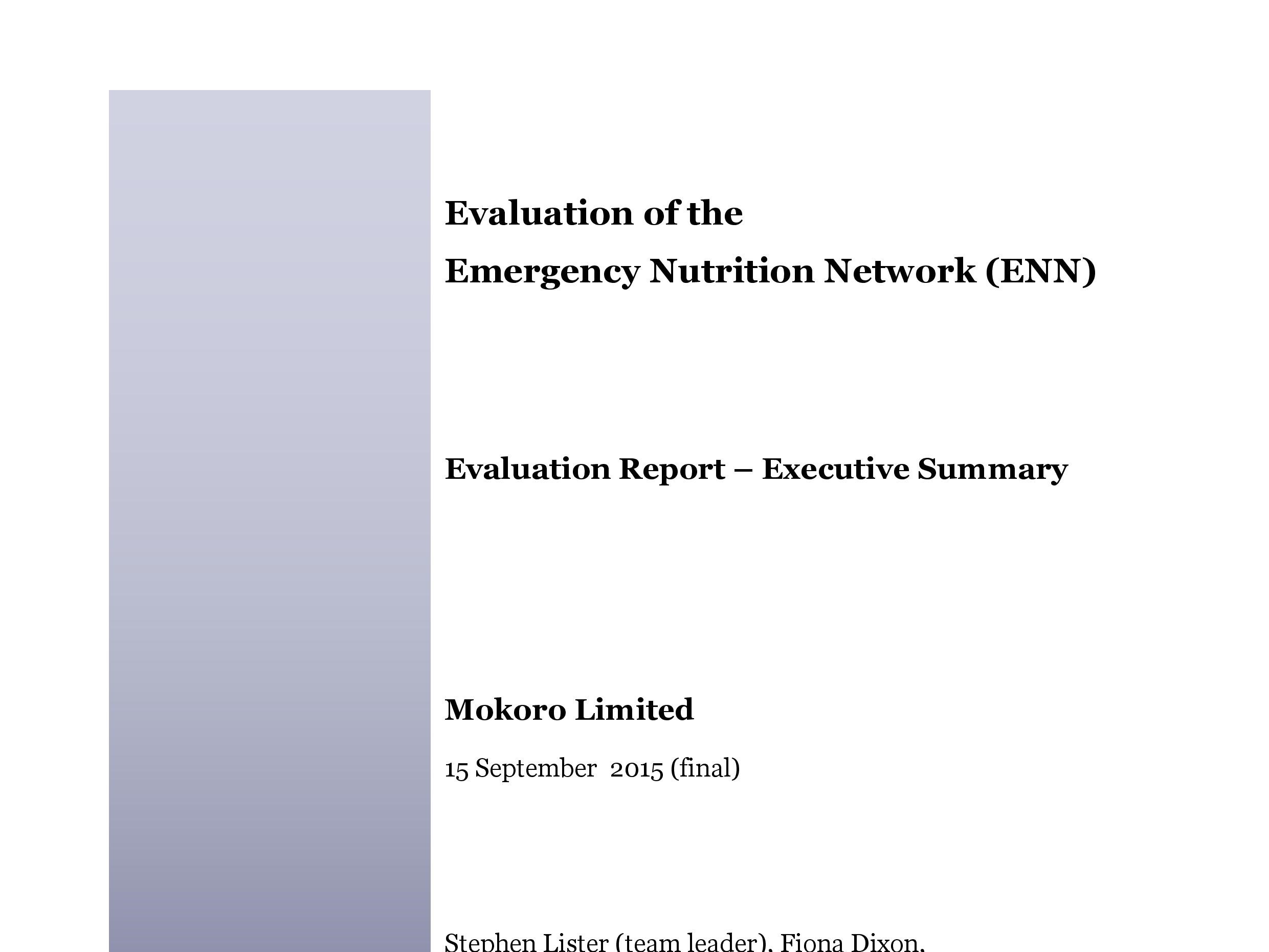 This is the report of an independent evaluation of the Emergency Nutrition Network (ENN), undertaken by a team from Mokoro Limited.