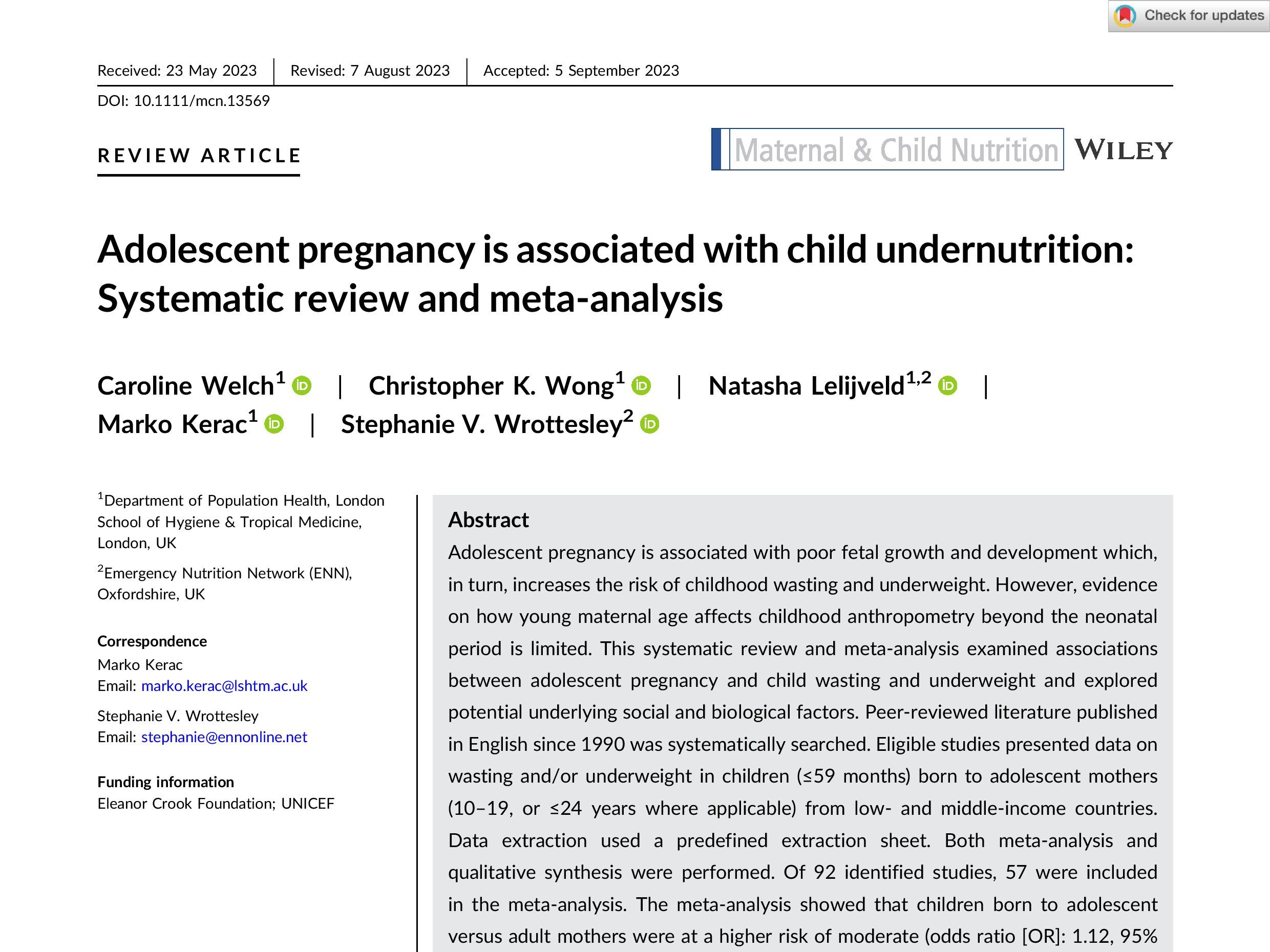 Welch, C., Wong, C. K., Lelijveld, N., Kerac, M., & Wrottesley, S. V. (2024). Adolescent pregnancy is associated with child undernutrition: Systematic review and meta-analysis. Maternal & Child Nutrition, 20, e13569. https://doi.org/10.1111/mcn.13569