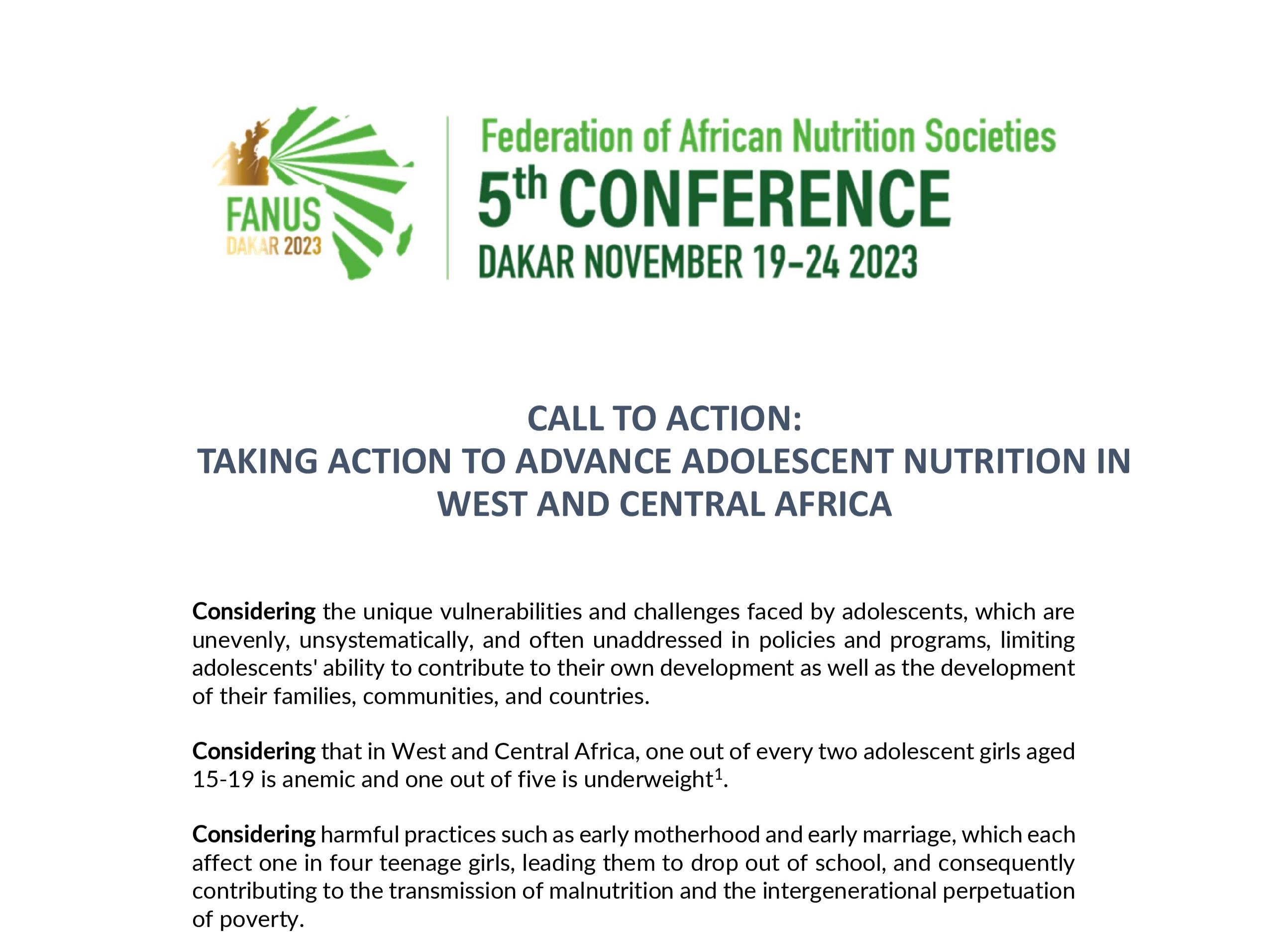 In November 2023, as part of the FANUS (Federation of African Nutrition Societies) Conference, the Regional Nutrition Working Group for West and Central Africa launched a "Call to Action" to advance adolescent nutrition. Learn more here.