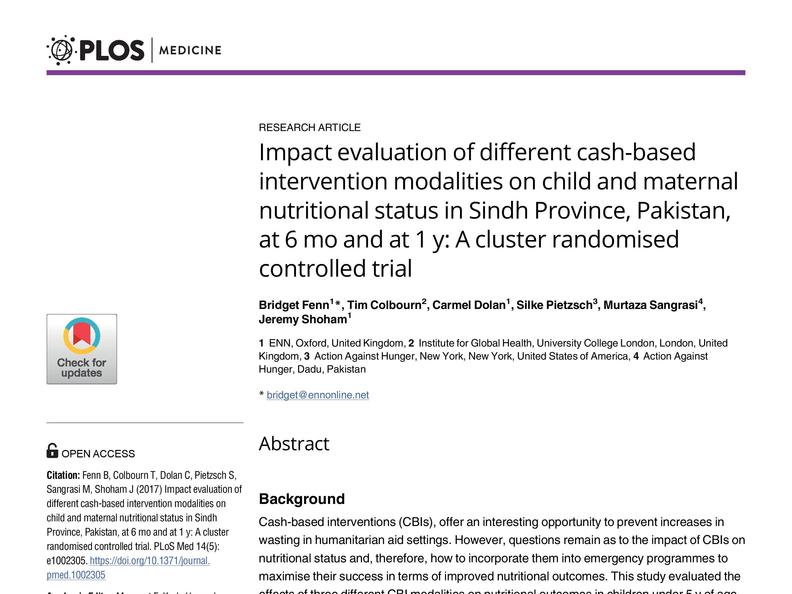 Full reference: Fenn B, Colbourn T, Dolan C, Pietzsch S, Sangrasi M, et al. (2017) Impact evaluation of different cash-based intervention modalities on child and maternal nutritional status in Sindh Province, Pakistan, at 6 mo and at 1 y: A cluster randomised controlled trial. PLOS Medicine 14(5): e1002305.https://doi.org/10.1371/journal.pmed.1002305