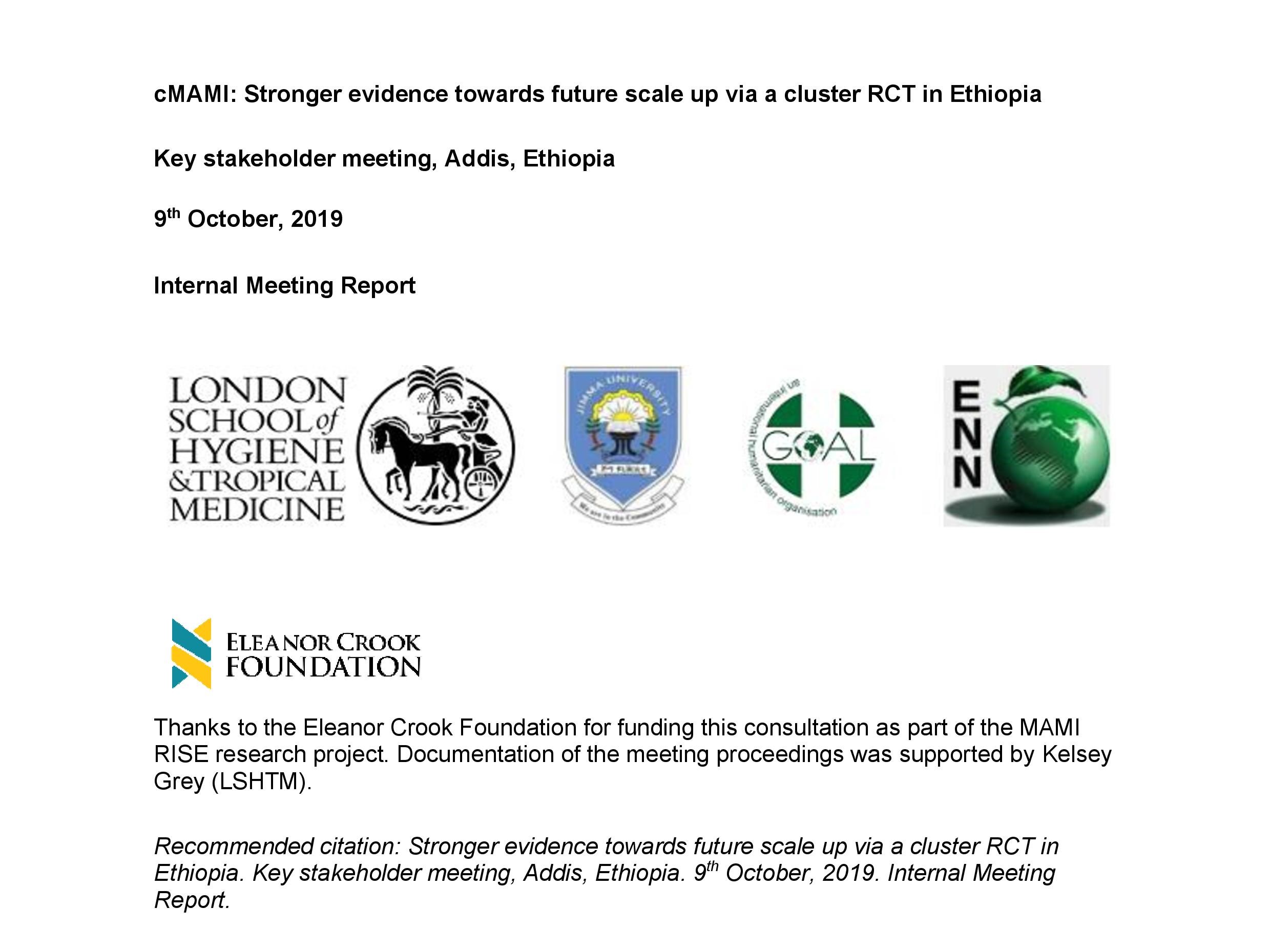 A one-day meeting of key stakeholders in the upcoming research on community management of at-risk mothers and infants under six months (cMAMI) in Ethiopia was held in Addis Ababa on October 9, 2019 co-hosted by the London School of Hygiene and Tropical Medicine (LSHTM), Jimma University, GOAL, and the Emergency Nutrition Network (ENN). A series of presentations on the MAMI approach, the proposed research, the policy environment and the Ethiopian context set the scene for working groups and plenary discussion throughout the day. Participants identified barriers and opportunities related to the research implementation in Ethiopia and key considerations for the formative research phase. Overall, the three top barriers and opportunities identified were the stretched health system capacity (barrier), the strong political will/policy environment/leadership in Ethiopia (opportunity), and that this research fills both local and global evidence gaps (opportunity).