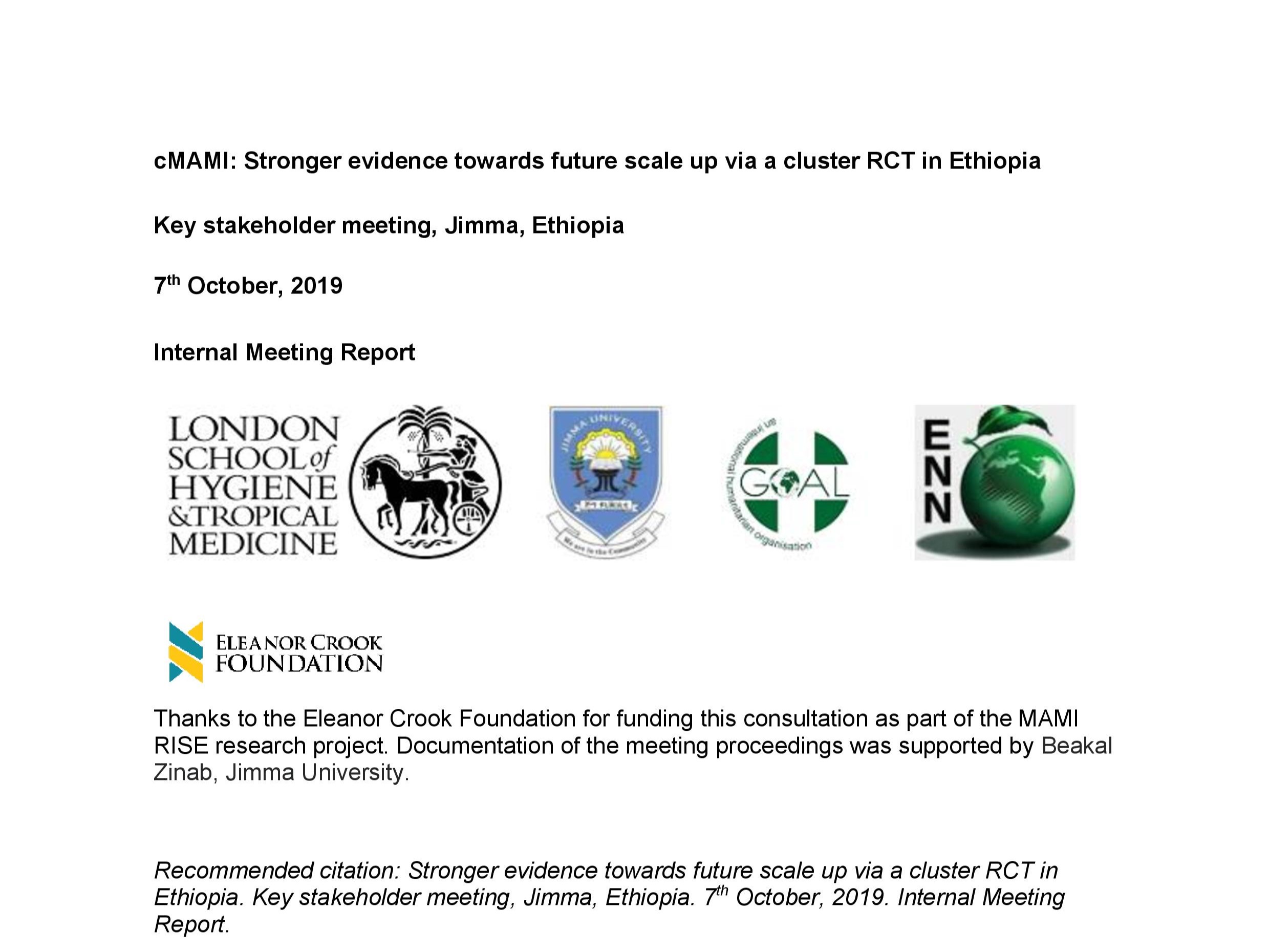 A one-day meeting of key stakeholders in the upcoming research on community management of at-risk mothers and infants under six months (cMAMI) in Ethiopia was held at Jimma University on October 7, 2019 co-hosted by the London School of Hygiene and Tropical Medicine (LSHTM), Jimma University, GOAL, and the Emergency Nutrition Network (ENN). A series of presentations on the MAMI approach, the proposed research, the policy environment and the Ethiopian context set the scene for working groups and plenary discussion throughout the day. Participants identified barriers and opportunities related to the research implementation in Ethiopia and key considerations for the formative research phase Overall, the three top-voted barriers and opportunities were that MAMI is a policy priority and this research will contribute to policy change (opportunity), the risk of defaulting during study follow up (barrier) and strong local and international collaboration (opportunity).