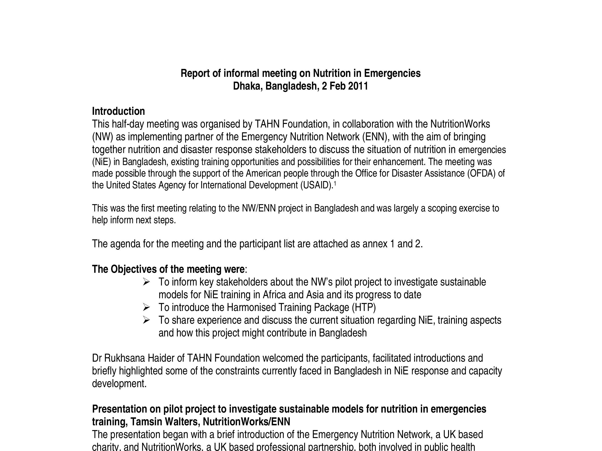 Report of informal meeting on Nutrition in Emergencies Dhaka, Bangladesh (2011)