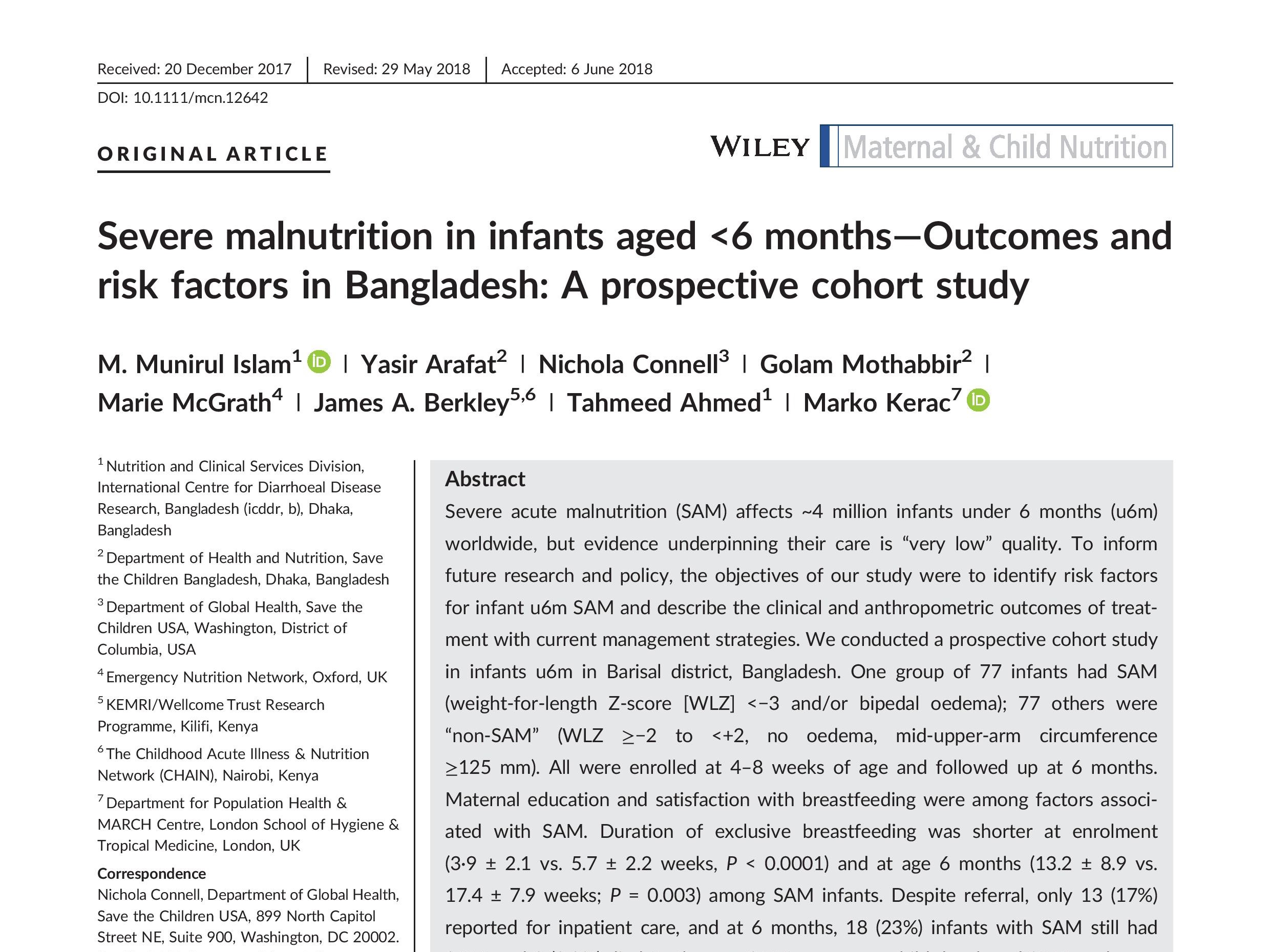 Severe acute malnutrition (SAM) affects ~4 million infants under 6 months (u6m) worldwide, but evidence underpinning their case is "very low" quality. To inform future research and policy, the objectives of our study were to identify risk factors for infant u6m SAM and describe the clinical and anthropometric outcomes of treatment with current management strategies. We conducted a prospective cohort study in infants u6m in Barisal district, Bangladesh. One group of 77 infants had SAM (weight-for-length Z-score [WLZ] <-3 and/or bipedal oedema); 77 others were "non-SAM" (WLZ â¥-2 to <+2, no oedema, mid-upper-arm circumference â¥125 mm). All were enrolled at 4-8 weeks of age and followed up at 6 months. Maternal education and satisfaction with breastfeeding were among factors associated with SAM. Duration of exclusive breastfeeding was shorter at enrolment (3.9 ± 2.1 vs. 5.7 ± 2.2 weeks, P < 0.0001) and at age 6 months (13.2 ± 8.9 vs. 17.4 ± 7.9 weeks; P = 0.003) among SAM infants. Despite referral, only 13 (17%) reported for inpatient care, and at 6 months, 18 (23%) infants with SAM still had SAM, and 3 (3.9%) died. In the non-SAM group, one child developed SAM, and none died. We conclude that current treatment strategies have limited practical effectiveness: poor uptake of inpatient referral being the main reason. World Health Organization recommendations and other intervention strategies of outpatients-focused care for malnourished but clinically stable infants u6m need to be tested. Breastfeeding support is likely central to future treatment strategies but may be insufficient alone. Better case definitions of nutritionally at-risk infants are also needed.