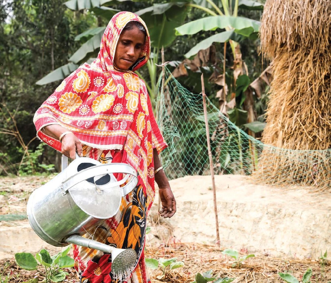 Front cover of the document Multi-sector programmes at the sub-national level: Implementation of the National Plan of Action for Nutrition 2 – A case study in Sunamgunj and Rangpur, Bangladesh showing a woman watering the crop