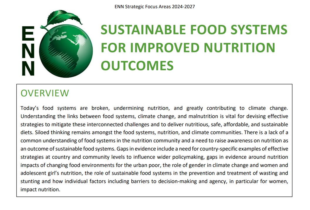 ENN will generate, curate, and share knowledge to positively influence policy and programming for sustainable food systems contributing to nutrition security. Our focus will be on examining and filling knowledge gaps around sustainable food systems within fragile and conflict-affected environments and how food systems can be better orientated for the prevention of malnutrition, including through a dietary approach.