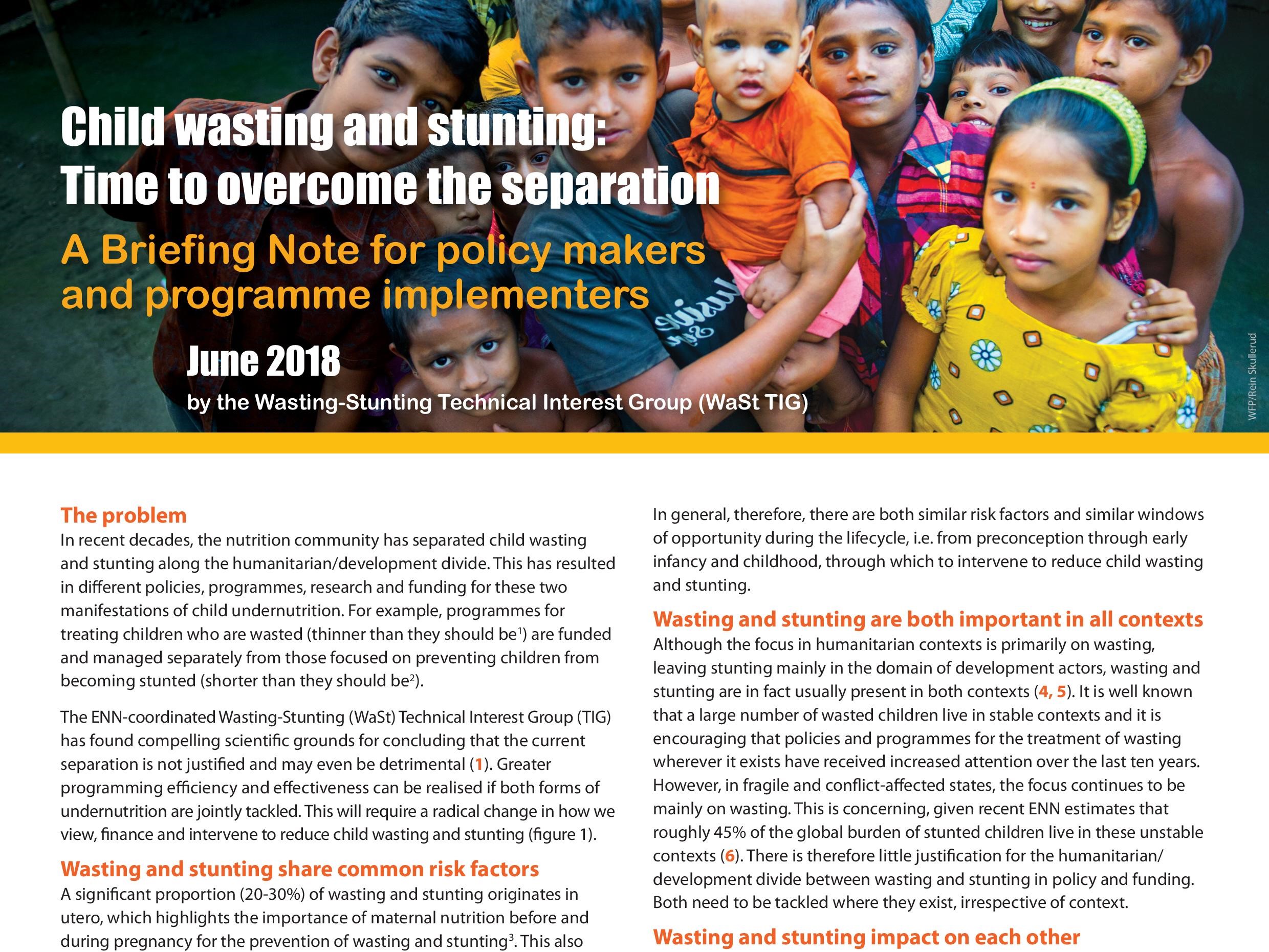 This policy brief is an is the culmination of the research and discussion of the ENN-coordinated Wasting-Stunting (WaSt) Technical Interest Group (TIG) over the last 4 yrs and presents the compelling scientific grounds for concluding that the current separation between wasting and stunting in policy, programmes and research is not justified and may even be detrimental. Greater programming efficiency and effectiveness can be realised if both forms of undernutrition are jointly tackled. This will require a radical change in how we view, finance and intervene to reduce child wasting and stunting.