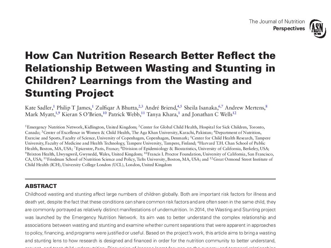 Sadler K, James PT, Bhutta ZA, Briend A, Isanaka S, Mertens A, Myatt M, O'Brien KS, Webb P, Khara T, Wells JC. How Can Nutrition Research Better Reflect the Relationship Between Wasting and Stunting in Children? Learnings from the Wasting and Stunting Project. J Nutr. 2023 Jan 14;152(12):2645-2651. doi: 10.1093/jn/nxac091. PMID: 35687496; PMCID: PMC9839990.