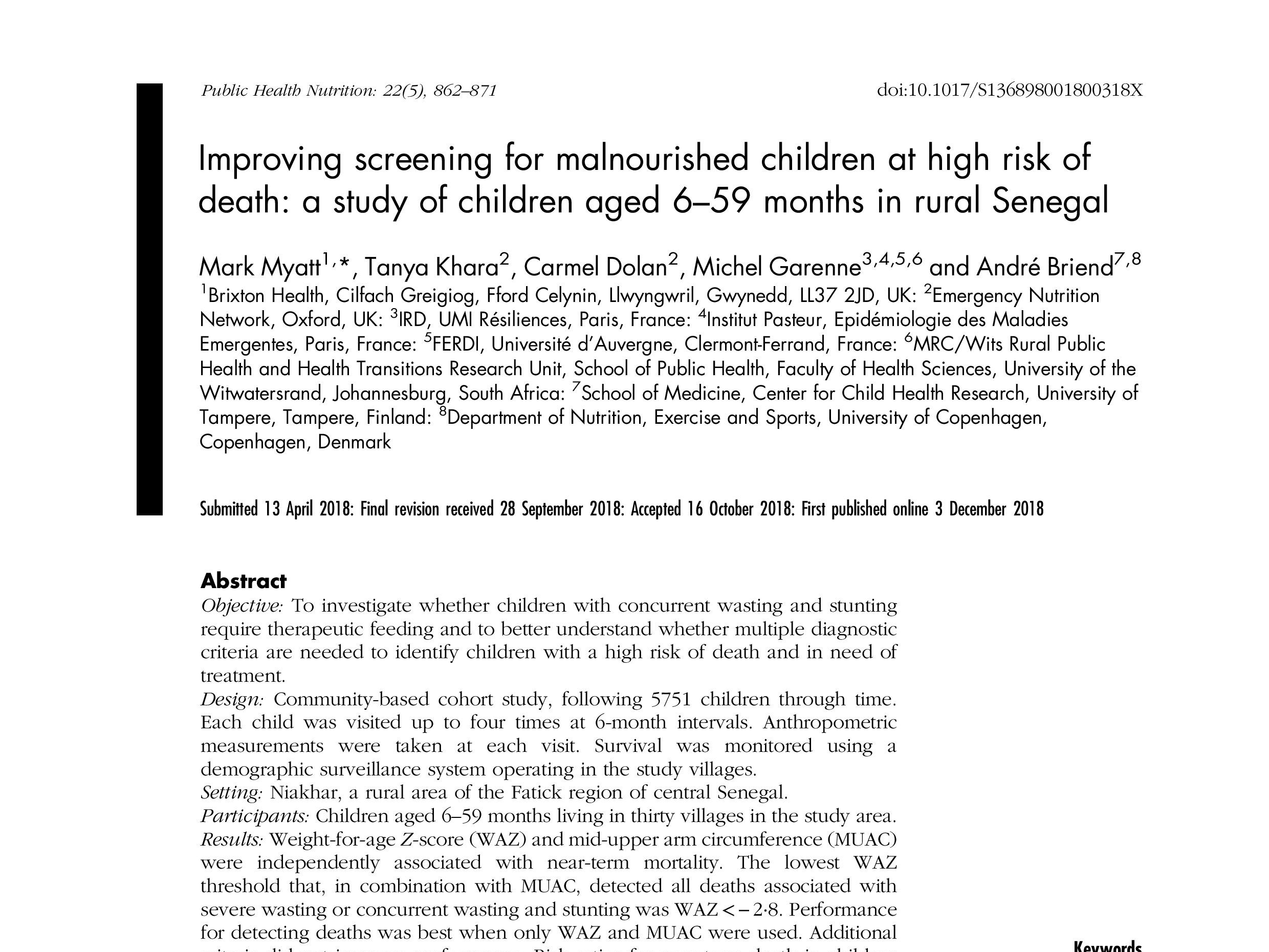 Myatt M, Khara T, Dolan C, Garenne M, Briend A. Improving screening for malnourished children at high risk of death: a study of children aged 6–59 months in rural Senegal. Public Health Nutrition. 2019;22(5):862-871. doi:10.1017/S136898001800318X