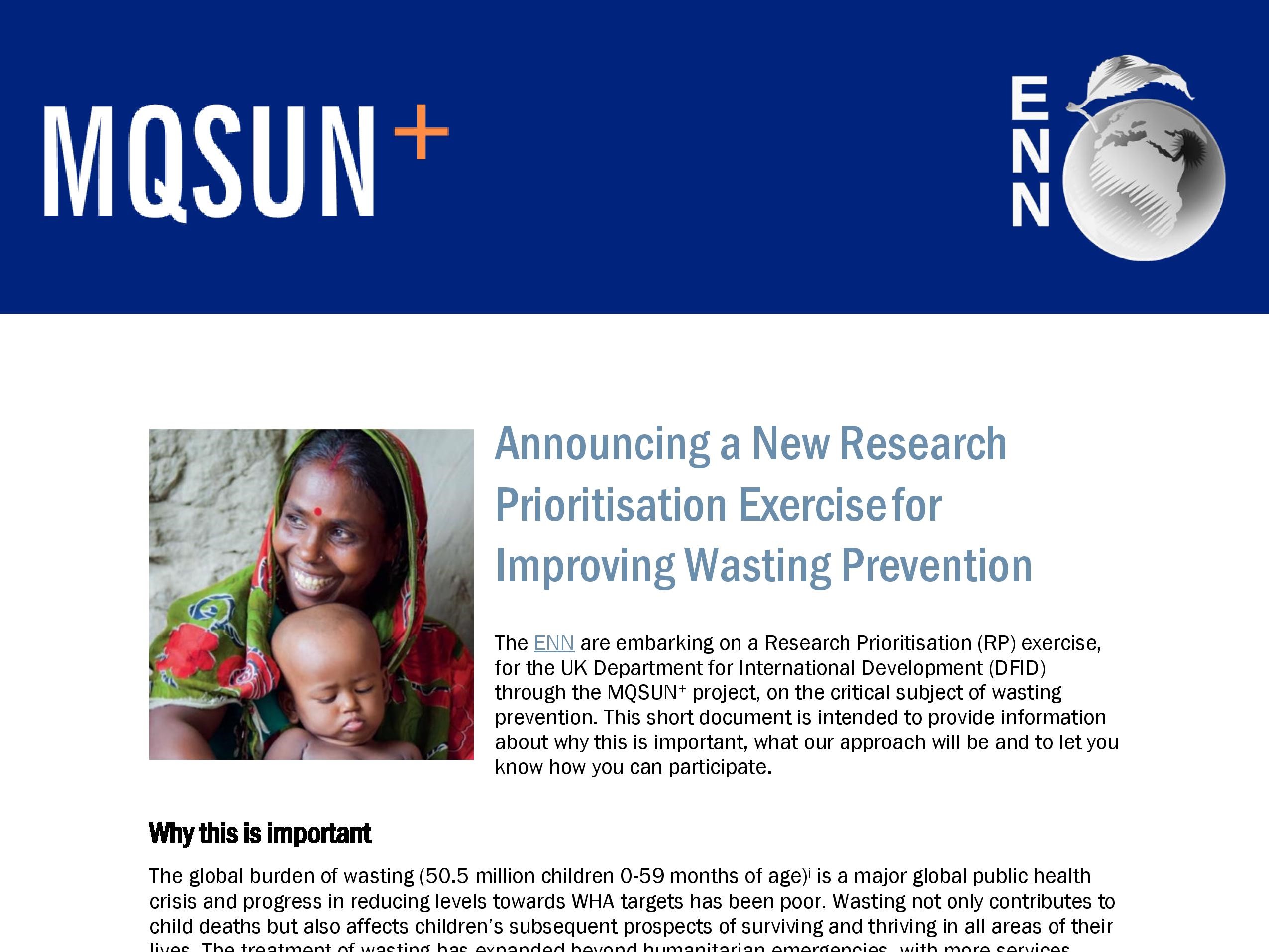 ENN is embarking on a Research Prioritisation (RP) exercise, for the UK Department for International Development (DFID) through the MQSUN+ project, on the critical subject of wasting prevention. This short document is intended to provide information about why this exercise is important, what our approach will be and to let people know how to participate.
