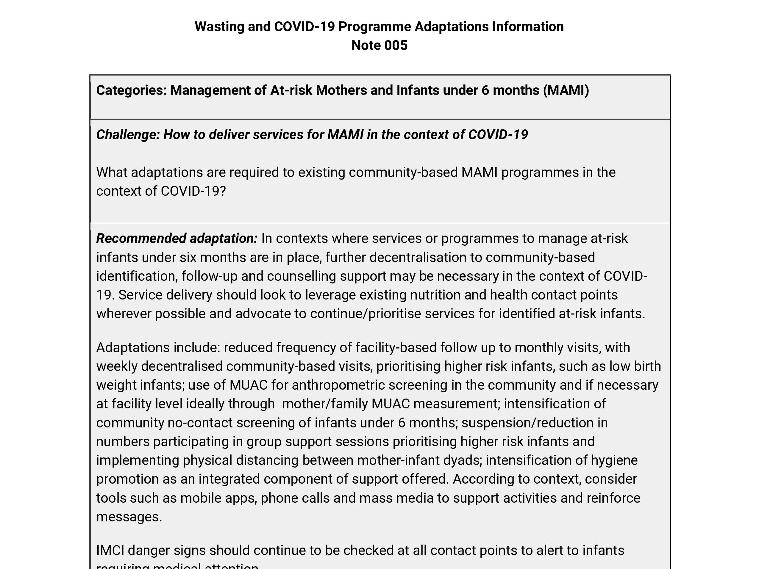 Programmes to support at-risk infants under six months and their mothers/ caregivers have been implemented in different contexts pre-COVID 19 pandemic, relying on facility-based identification and contacts. In situations where there is heightened risk of transmission of COVID-19 and/or movement restrictions, it may not be possible to follow existing protocols for the screening, enrolment, and facility-based support visits for the delivery of these MAMI services. Many other nutrition services are moving towards community-based delivery, and similar adaptations to MAMI programme delivery may be needed to ensure the continuation of services.